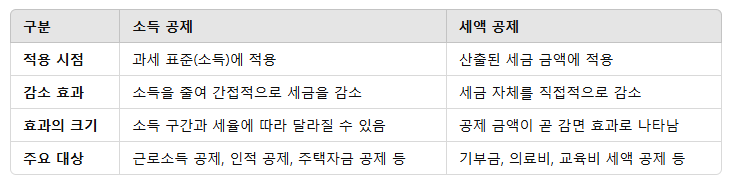 세금 자체를 줄이는 방식으로, 세금 감면 효과가 더 직접적입니다.