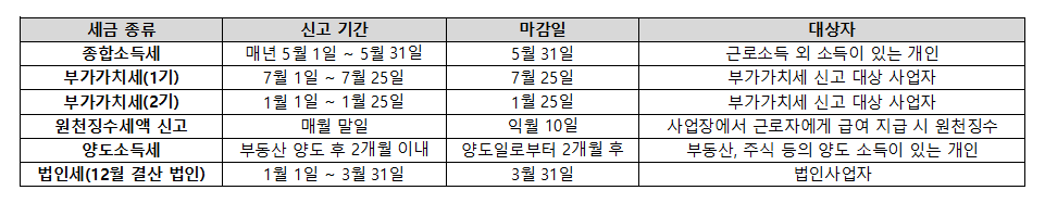 소득세 신고 마감일은 5월 31일이며, 아래는 주요 세금 신고 마감일을 정리한 표입니다. 세금 신고 유형에 따라 마감일이 다를 수 있으므로 자신의 신고 유형에 맞는 일정을 확인해야 합니다.