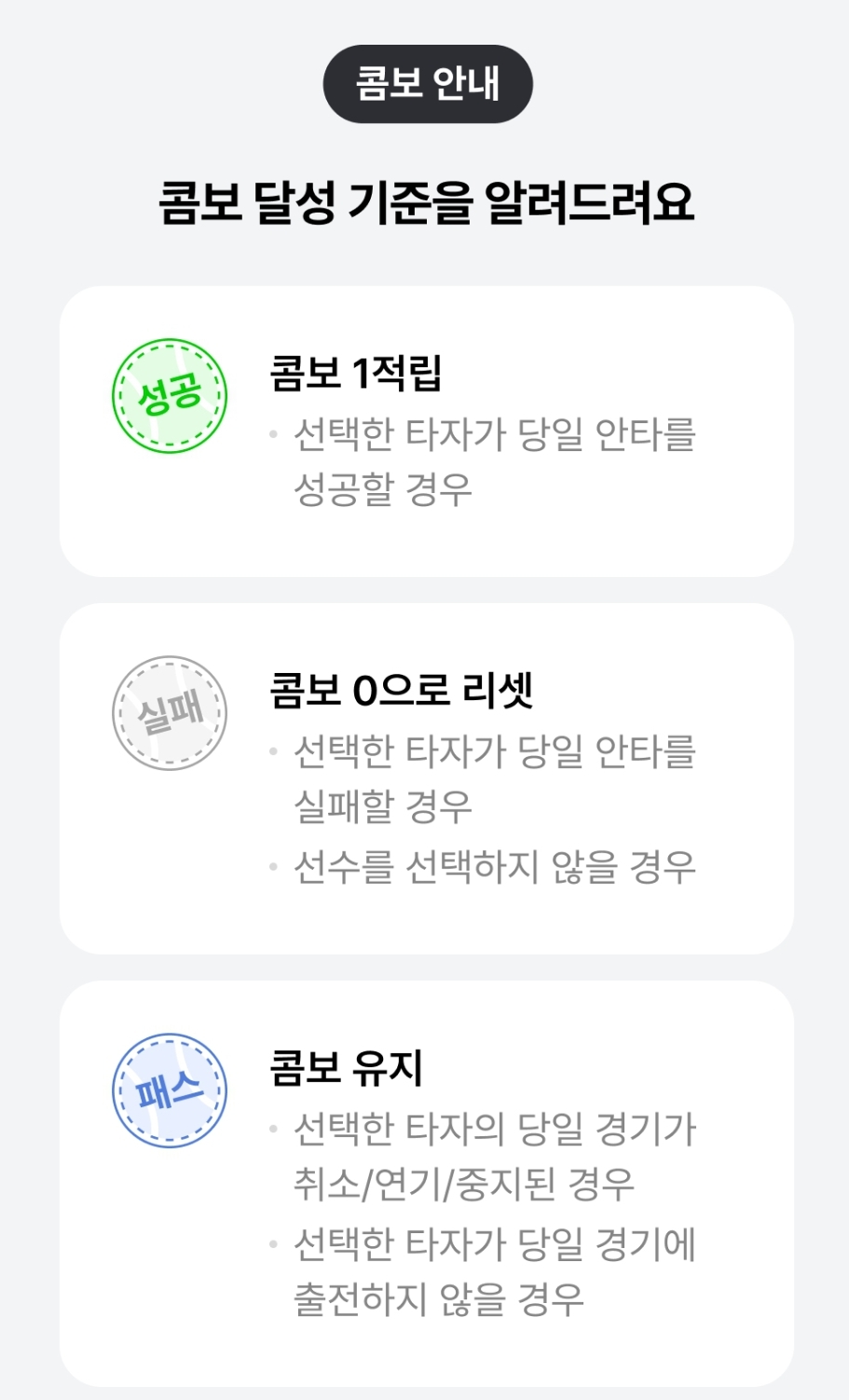 ★ 실패 / 콤보 0으로 리셋 / 선택한 타자가 당일 안타를 실패 할 경우, 선수 미선택시