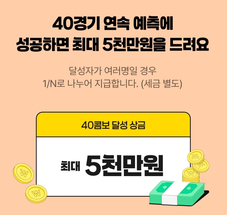 이렇게 40콤보 달성시 상금 최대 5천만원을 받을 수있는 게임입니다 (달성자가 여러명일 경우 1/n 지급)